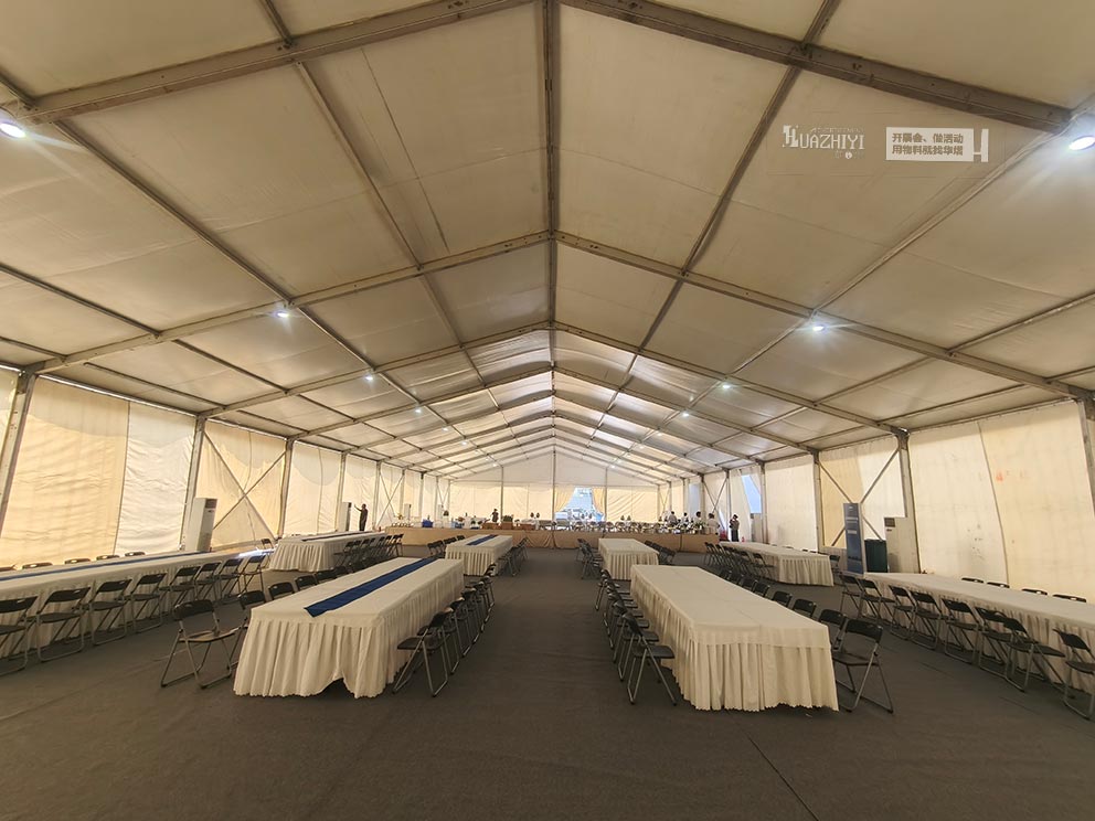 篷內的布局兼顧實用與涼爽。長條桌兩側擺放著折疊椅,椅腿底部的防滑墊與篷內地面的防滑地膠緊密貼合,即便有人突然起身,椅子也不會輕易滑動??照{的布置讓清涼均勻覆蓋。濟源篷房租賃篷房內配置了立式空調,出風口斜向地面 45 度,避免冷風直接吹向人體??照{設定在 26℃的恒溫狀態,冷凝水管被細心地引至篷外,地面看不到任何水漬。