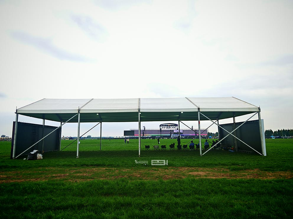 邯鄲邢臺篷房租賃搭建的人字形篷房,選用白色高密度PVC篷布,搭配銀色鋁合金支架,外觀簡約大氣且抗風防雨。人字形篷房的高頂設計提升了內部空間感,四周無篷布的設計,即便人員密集也能保持空氣流通,避免悶熱。