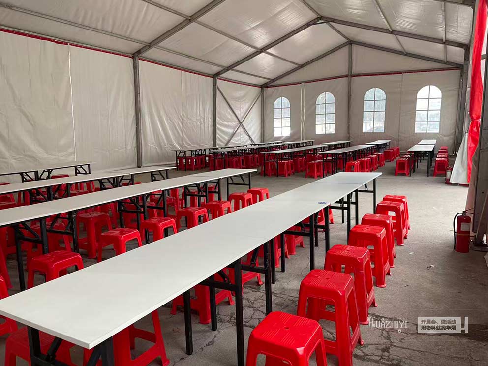 周口篷房出租以紅色用餐篷房為核心,搭配長條桌與紅色方凳,完美解決戶外用餐的場地難題,既打造了喜慶大氣的用餐氛圍,又保障了用餐的便捷性與舒適性。
